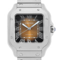 - カルティエを代表するサントスウォッチ。飛行士であるアルベルト・サントス・デュモンから「飛行中に見やすい腕時計を」という意見から生まれたサントスは、 円形の懐中時計しか存在しなかった時代に角型という斬新なデザインで発表されました。こちらは2024年モデルのブラウン文字盤です。