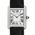 - こちらの“タンクソロ”は、 シンプルな角型ケースとブラウンカーフストラップを組み合わせた数あるタンクコレクションの中でも、大変スマートな印象を与えるモデルです。10時位置のインデックスに“CARTIER”の文字が隠されており、細部にまでこだわりが感じられる逸品です。