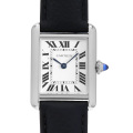 - 2021年発表のタンク マストは、 シンプルな角型ケースとブラックカーフストラップを組み合わせた数あるタンクコレクションの中でも、丸みのある優雅なフォルムが特徴的なモデルです。10時位置のインデックスにCARTIERの文字を隠しており、細部にまでこだわりが感じられる逸品です。
