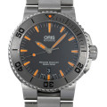 - オリスを代表するダイバーズモデル「アクイス」。こちらはグレー色の文字盤です。300m防水を備えた堅牢なケースに自動巻きムーブメントを搭載し、ベゼルはセラミック仕様です。針とインデックスはオレンジ色を用い、視認性が高く、スタイリッシュでオールラウンダーなモデルです。