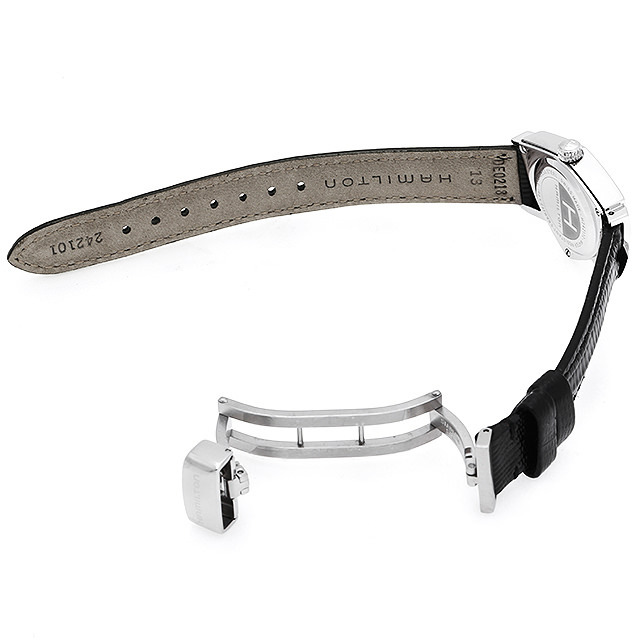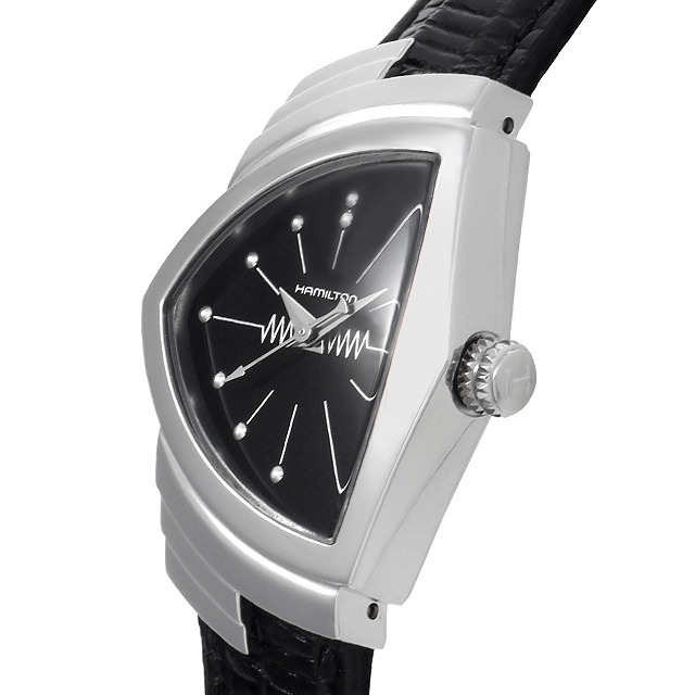 - 1957年、世界初の電池式時計として誕生した「ベンチュラ」。そのデザインは発売から50年以上たった今でも、圧倒的な存在感を放ちます。ポイント状にエンボス加工されたインデックスがスタイリッシュな1本。独創的なケースフォルムと見事に一体化したストラップなど、デザインとテクノロジーの新境地に挑んでいます。