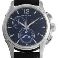- こちらのモデルは10時に30分計、6時にスモールセコンド、2時にごく小さな1/10秒計、4時の窓に日付を表示します。中でも深いブルーダイヤルに淡いブルーインダイヤルを合わせたこのモデルは、ブラックのステッチ入りクロコ型押しレザーベルトも魅力的です。