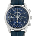- 2005年に発表された”マスターコレクション”を入荷いたしました。クラシカルなデザインの中にエレガントさも併せ持つラインナップで人気です。トリプルカレンダー機能に加え、クロノグラフとムーンフェイズという複雑機構を兼ね備えています。光の加減や角度で色目を変えるサテンブルーの文字盤が非常に綺麗なモデルとなっております。防水3気圧。パワーリザーブ54時間。