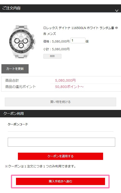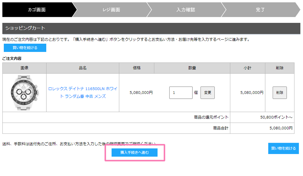 ご希望の商品を選択し「カートに入れる」ボタンをクリックします。「ショッピングカート カゴ画面」に進みますので、ご確認のうえ「購入手続きに進む」ボタンをクリックしてください。