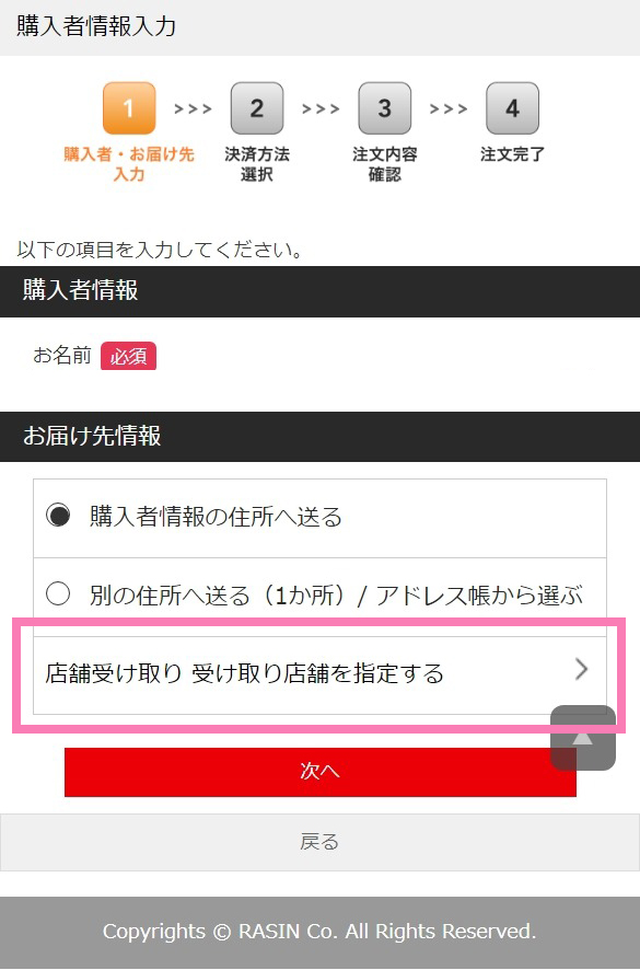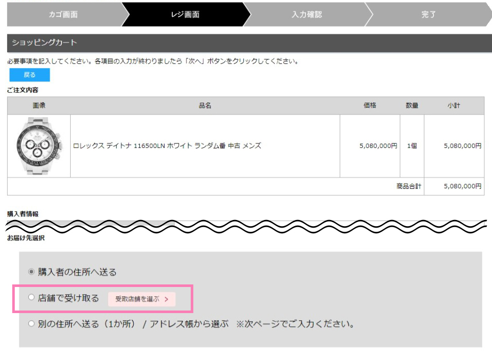 ① お届け先を「店頭受取」に指定、お支払いをします。