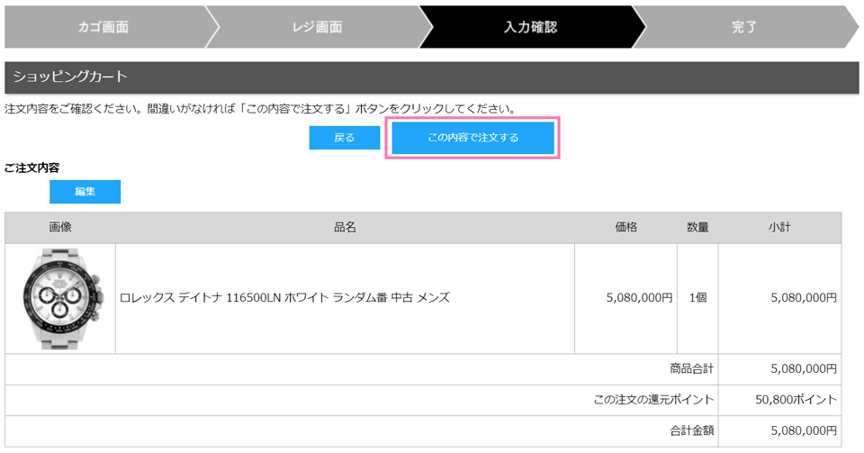 そのまま次の画面へお進み頂き、注文内容をご確認後「この内容で注文する」ボタンをクリックしてください。