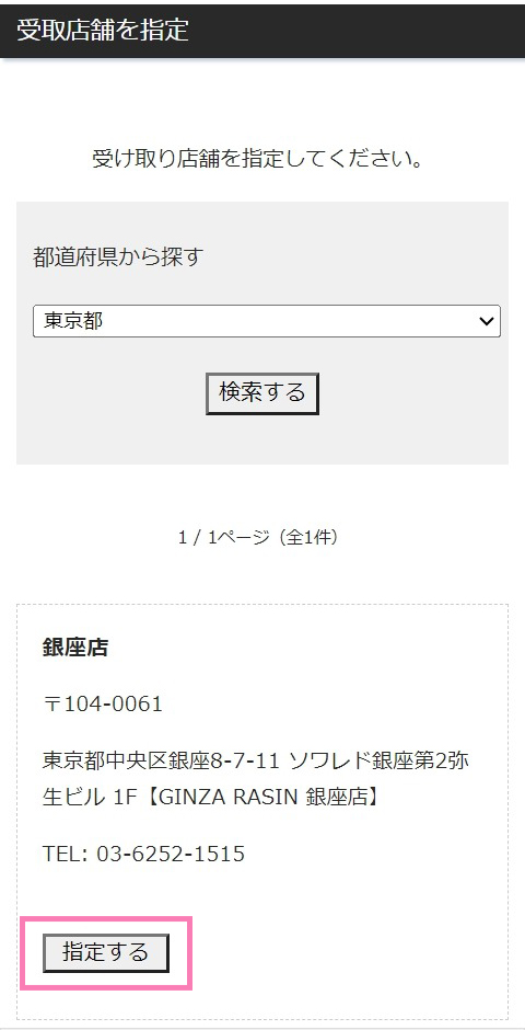 受取店舗を指定のページに遷移しますので、ご希望の店舗を指定してください。