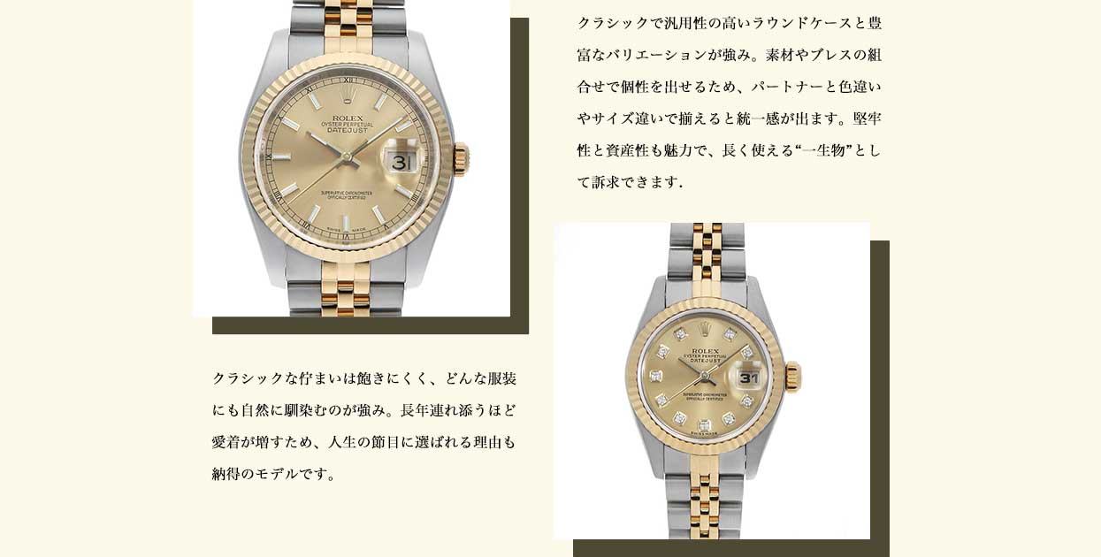 豊富なサイズ・素材・文字盤バリエーションにより、個々の好みやライフスタイルに合わせて選べます。フルーテッドベゼルやジュビリーブレスなどのディテールは腕元を華やかに見せるジュエリー性を持ちつつ、クラシックなプロポーションで世代を問わず愛されるデザインです。