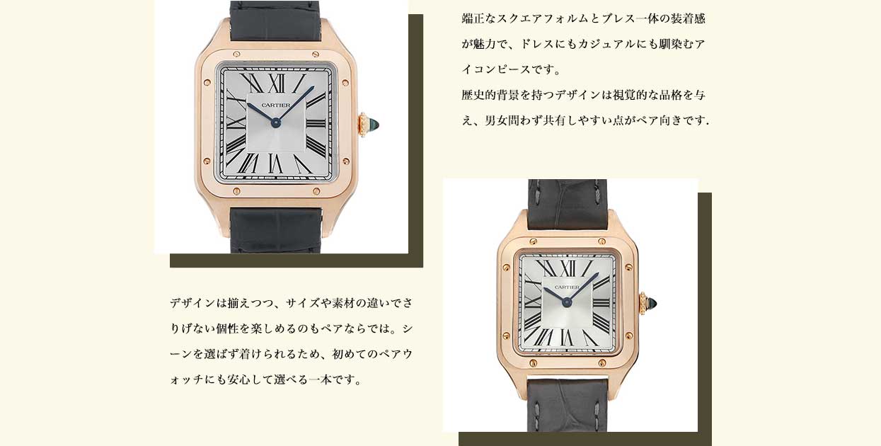端正なスクエアフォルムとブレス一体の装着感が魅力で、ドレスにもカジュアルにも馴染むアイコンピースです。歴史的背景を持つデザインは視覚的な品格を与え、男女問わず共有しやすい点がペア向きです。