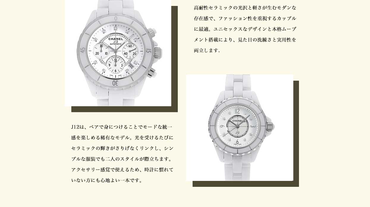 J12は、ペアで身につけることでモードな統一感を楽しめる稀有なモデル。光を受けるたびにセラミックの輝きがさりげなくリンクし、シンプルな服装でも二人のスタイルが際立ちます。アクセサリー感覚で使えるため、時計に慣れていない方にも心地よい一本です。